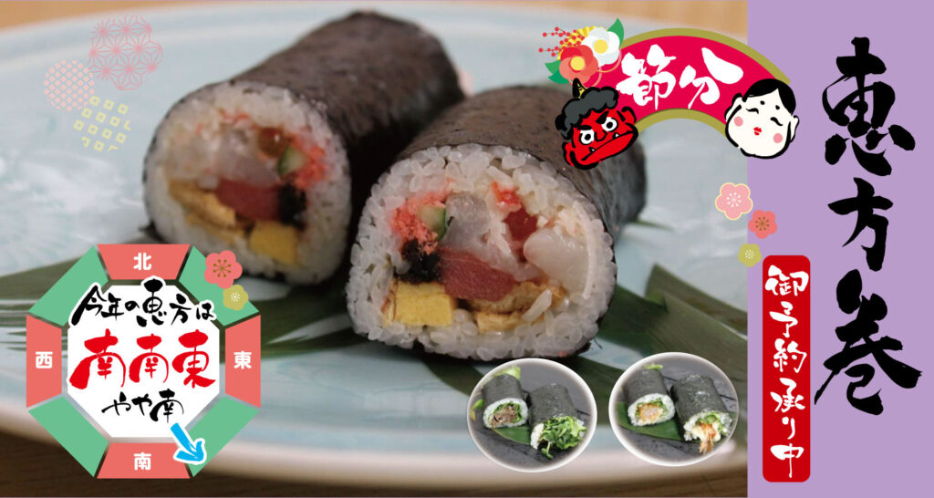 2025年1月21日 / 最終更新日時 : 2025年1月21日 mhr_admin お知らせ 2025年 恵方巻ご注文承ります 節分に恵方巻を食べて厄除け願いごとを叶えましょう。今年の恵方は西南西です。 宗弘では今年も節分の恵方巻をご準備させていただいております。たっぷりの海鮮が入った豪華な海鮮巻からお子さまも大好きな納豆巻まで。お好きな具を選ん […]