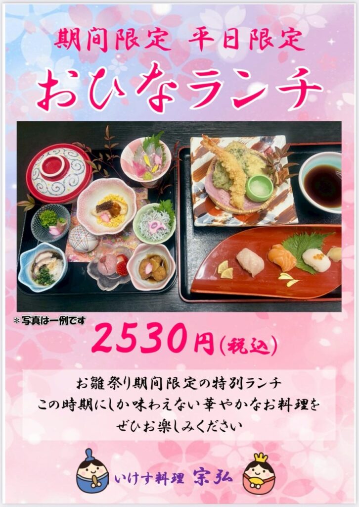 お雛祭り おひなコース・おひなランチ 2026年2月17日 最終更新日時 : 2026年2月17日 mhr_admin 八代市では2/14~3/8まで、お雛祭りが開催中!本町では雛人形の展示、イベントなども催し中です。 お雛祭り開催に合わせて当店ではおひなコース(6,600円〜)を開催しております❗️ また合わせて上記『おひなランチ』も絶賛開催中です。月曜日~金曜日の平日11:30〜14:00のご提供となります(Cony hope)その他、日替わりランチ、漁師ランチ等もございますのでぜひお誘い合わせ後ご来店お待ちしております \ 最新情報をチェック /